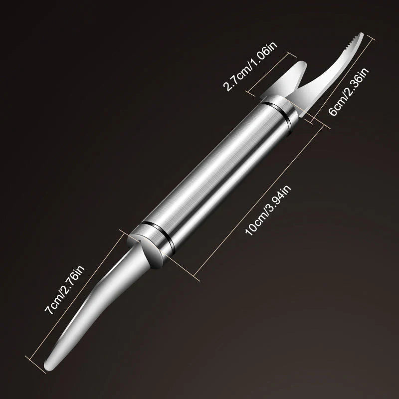Two rows of knife blades, a long and a short, the long one can be used to cut off the head of shrimp, divide the fish, pick out the shrimp thread and other work. The short one is used to work together with the long one, which can shave the belly of the fish; the double row of blades can clean the fish scales more thoroughly.