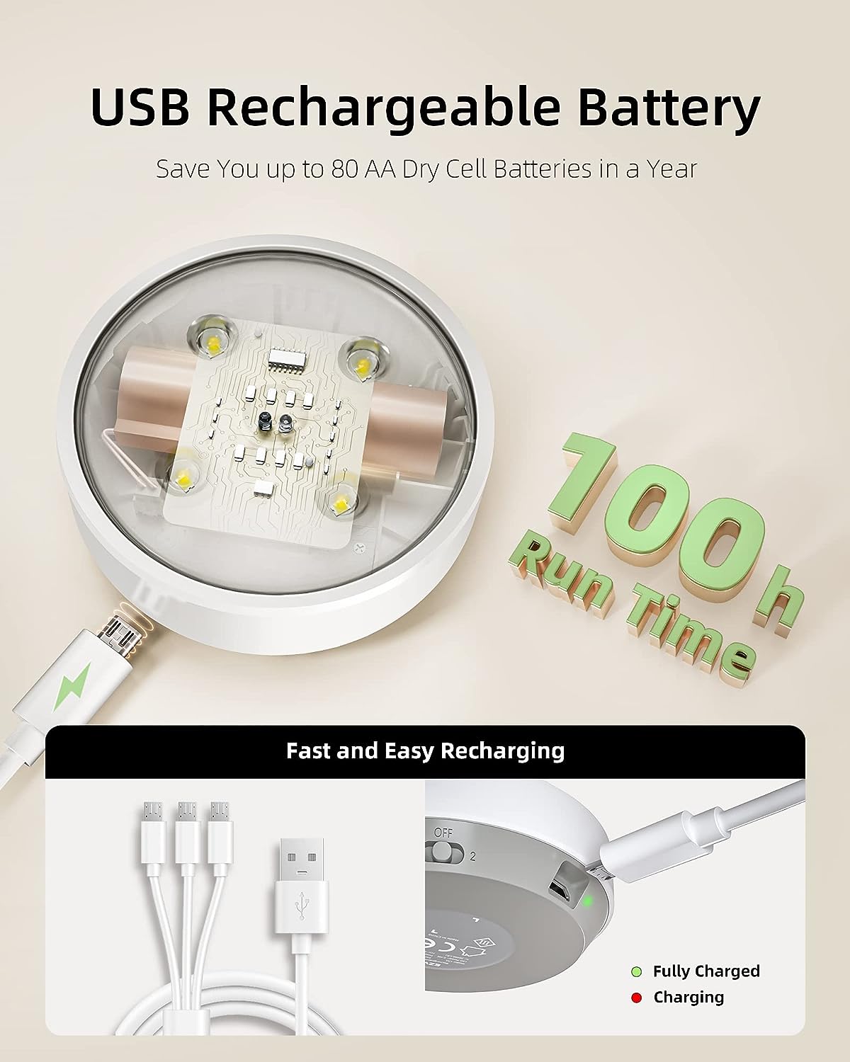 No need to waste $ on batteries nor need to worry about consistently charging, The USB rechargeable battery lasts 100 hours per charge.