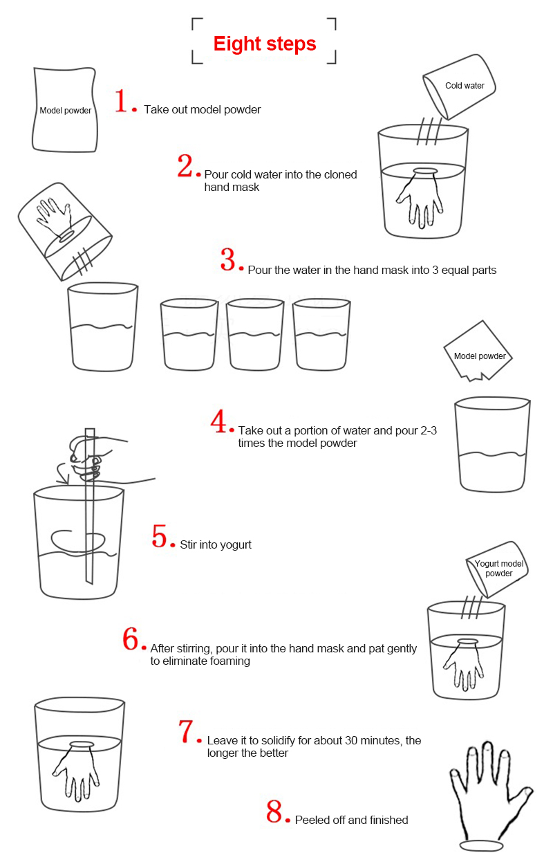 Mold making: The molding material is cold-qualified, non-toxic and non-allergenic. You just have to dip your hand on the molding gel and wait for about 30 seconds before pulling them back up. The entire set-up time is about 6 minutes, including mixing time.