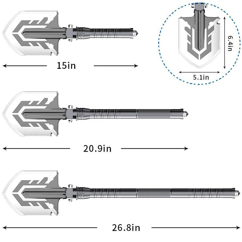 The shovel surface is designed with rotary cutter, fish cutter, survival cone, screwdriver (+/-) whistle, universal knife, big profile knife, hex tool, bottle opener, sawtooth, shovel and the detachable design is convenient for putting it directly into a backpack or car.